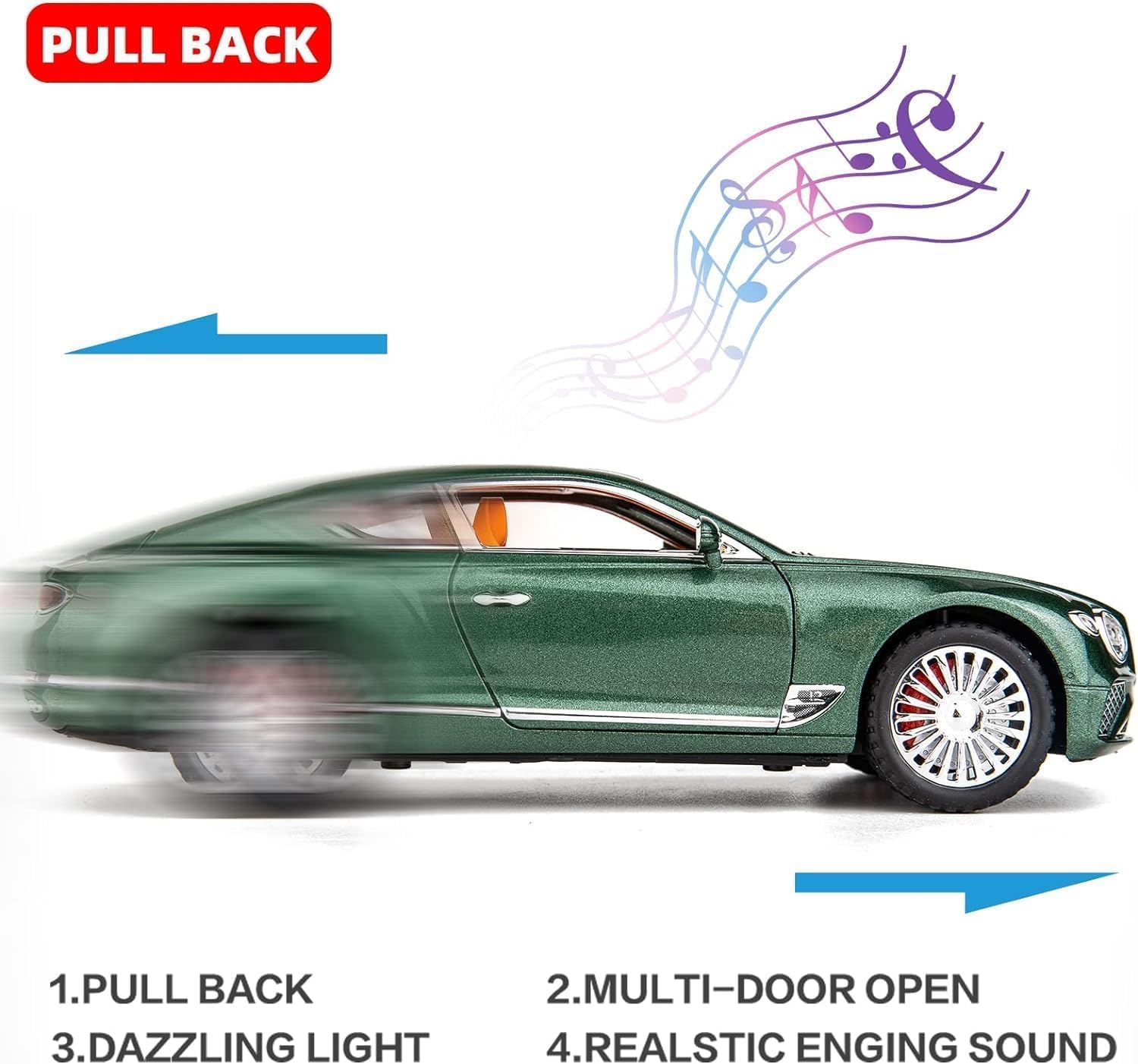 أضواء موسيقية وأصوات محرك واقعية. نظام سحب خلفي لتحقيق سرعة كبيرة.